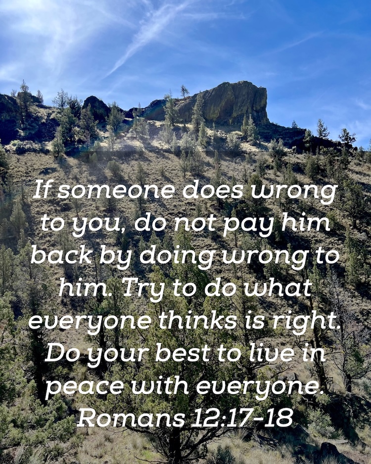 Does Wrong to You If someone does wrong to you, do not pay him back by doing wrong to him. Try to do what everyone thinks is right. Do your best to live in peace with everyone. Romans 12:17-18 NCV